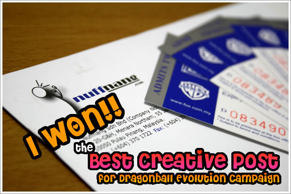 Last week, I received a call from an unknown number and to my surprise, it was Robb caling from Nuffnang. Suprisingly, I was told that I won the Best Creative Post for the DragonBall Evolution Campaign Contest with my previous post. It was unbelievable for me as I never thought I would actually win in the contest as I had never win in a contest before.
