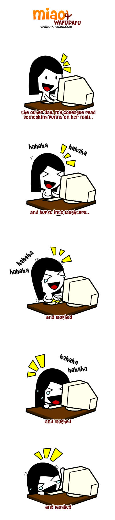 7. hahaha! i also got few colleagues just like your colleague, always laugh until fall down from the chair but at the end i still waiting for them to tell me what stuff so funny!